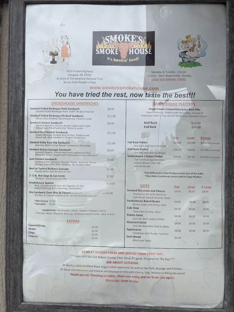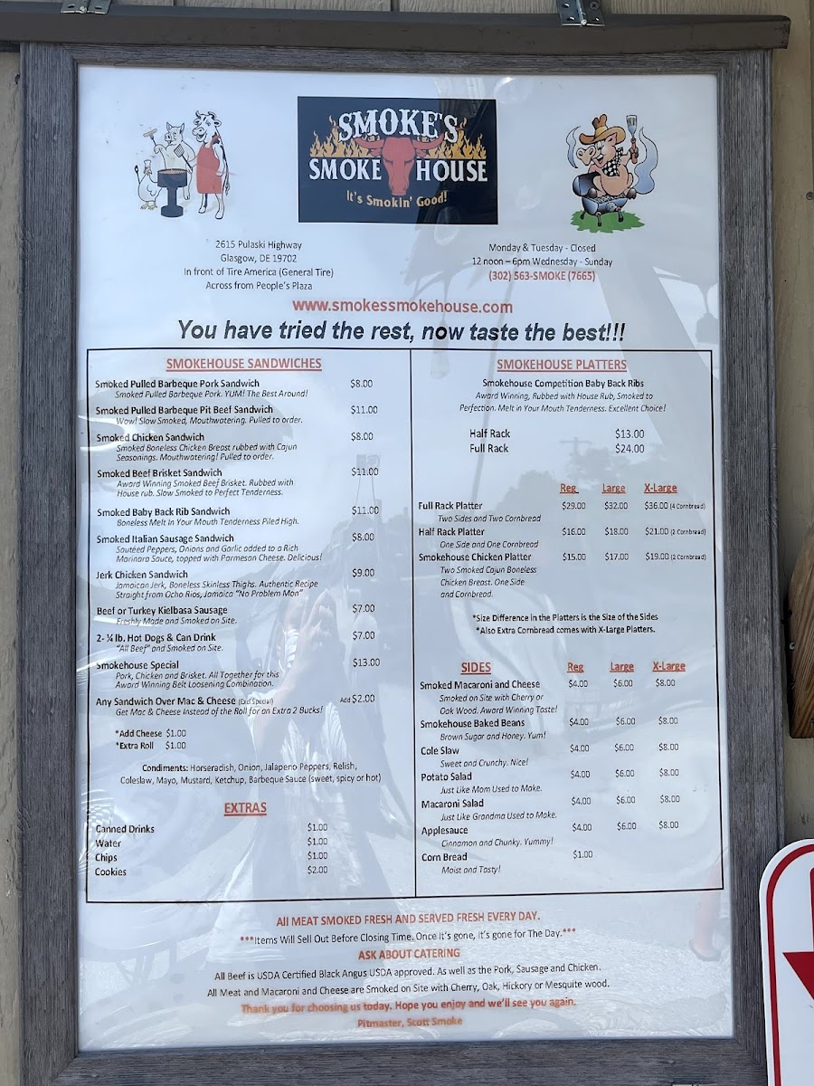 Welcome to Smoke's Smokehouse, where the art of barbecue is perfected! Located at 2615 Pulaski Hwy, Newark, DE, this smokehouse is a haven for barbecue lovers. The menu boasts award-winning Smokehouse Competition Baby Back Ribs, which are expertly rubbed and smoked, resulting in tenderness that truly melts in your mouth.